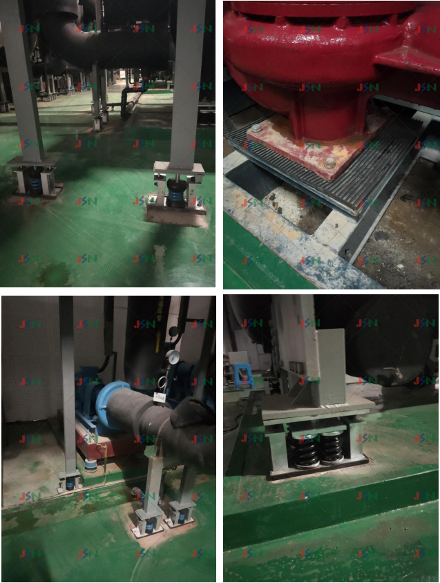 現(xiàn)場(chǎng)由于未整體考慮安裝減振器,機(jī)房?jī)H是6臺(tái)水泵安裝減振器,其余多為固定連接、冷卻塔為膨脹螺絲固定硬連接安裝,對(duì)振動(dòng)傳遞有明顯幫助,導(dǎo)致在設(shè)備運(yùn)行中整個(gè)機(jī)組產(chǎn)生強(qiáng)烈振動(dòng)能量,樓板及管道支架能明顯感覺(jué)到振動(dòng)現(xiàn)象,通過(guò)固體傳遞,產(chǎn)生2次低頻噪音影響。