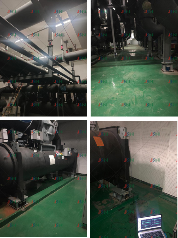 案例簡(jiǎn)介:項(xiàng)目現(xiàn)場(chǎng)為工商銀行浙江分行總部大樓,采用框架結(jié)構(gòu),設(shè)備在大廈負(fù)一樓有2臺(tái)離心式冷水機(jī)組、3臺(tái)立式水泵機(jī)組、 1臺(tái)螺桿壓縮機(jī)組及有6臺(tái)循環(huán)水泵相連管道。設(shè)備運(yùn)行在樓上大廳有嚴(yán)重的低頻噪音及振感。