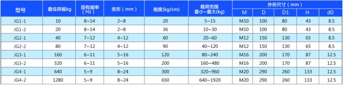 JG型橡膠隔振器由金屬件及橡膠體粘貼而成,其彈性體采用軸對(duì)稱環(huán)狀剪切型結(jié)構(gòu),本系列產(chǎn)品分4種尺寸結(jié)構(gòu),10種承載規(guī)格,軸向承受額定載荷從10~1280kg,阻尼比大于0.06,對(duì)共振的抑制力強(qiáng)。該減震器外形美觀,結(jié)構(gòu)緊湊,與同類型相同規(guī)格隔振器相比結(jié)構(gòu)尺寸小,重量輕,安裝更換方便,工作安全可靠,能在-5℃~+50℃范圍內(nèi)保持正常工作。JG減震器對(duì)800r/min以上回轉(zhuǎn)及往復(fù)機(jī)械振動(dòng)的隔離具有很好的隔振效果,適用水泵、風(fēng)機(jī)、空壓機(jī)、柴油機(jī)、冷凍機(jī)等機(jī)械設(shè)備的振動(dòng)隔離及儀器儀表防振、防沖擊。本產(chǎn)品也適用于航空、船舶及機(jī)車(chē)中各類設(shè)備的振動(dòng)隔離和防護(hù)。